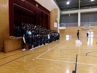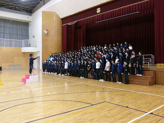 来たる対面式、着任式及び離任式に向けて、在校生が体育館に集まり、歌の練習を行いました。休みにも関わらず、たくさんの生徒が集まり、一生懸命に練習をしました。