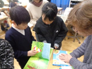 休み時間には、持ってきていただいた 点訳された絵本を見せていただきました。 目をつむって触って読んでみます。 |