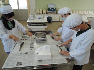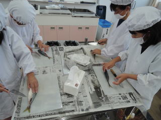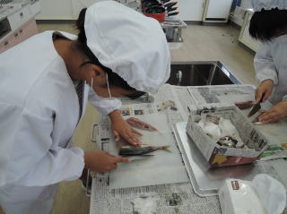 できるだけ身を多く残すために、骨を意識しながら慎重におろしていきます。 包丁を使い慣れていない児童もたくさんいましたが、みんなとっても上手にさばけました。 |