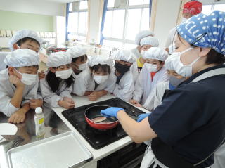 児童の感想より ・最初は魚を触るのが気持ち悪かったけど、食べたら美味しすぎてびっくりしました。 ・意外と上手にさばけてうれしかったです。 ・釣った鯛が家にあるので、家に帰ったらさばいてみたいです。 ・3枚おろしの仕方がわかったので、次は違う魚をさばいてみたいです。 ・いつもは皮や骨を残すけど、知らない間に食べていました。 |