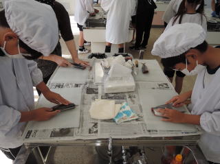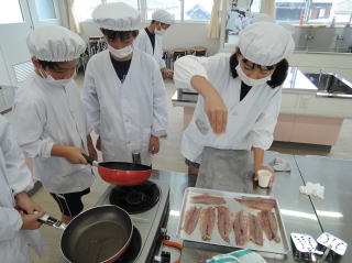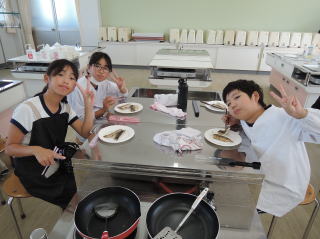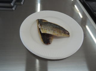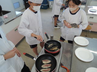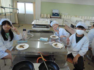 アジのソテーの完成です。 味付けは塩コショウのみと、シンプルですが、外はカリッ、中はフワッ、とってもジューシーでした。 さばくときに少し怖がっていた児童も、あまりの美味しさにびっくりしていました。 やっぱりさばきたては、違うようです。 |