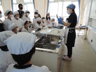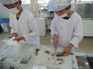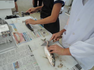兵庫県漁業協同組合連合会から2名の方に来ていただき、魚のさばき方を教えていただきました。 今日のお魚はアジです。 初めて出刃包丁を扱うので、みんな真剣に説明を聞きます。 |
