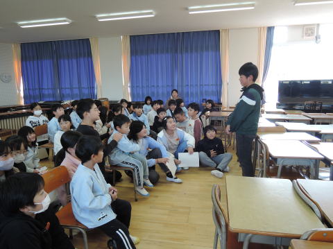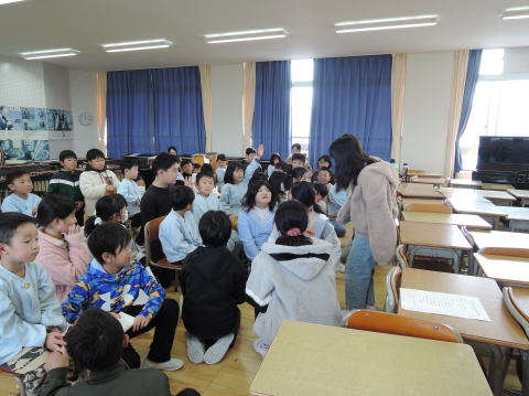 たくさんのお兄さんお姉さんに囲まれて、最初は緊張していた幼稚園のお友だちも、帰るころには、とっても優しい表情に変わっていました。5年生は、「かわいいなー」と別れを惜しむ一方、「教えるって難しいねんなー。」と、改めて感じたようです。どちらにとっても良い経験となる1時間でした。 |