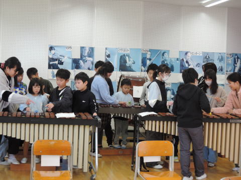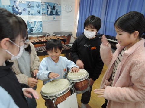 幼稚園のお友だちを招いて、一緒に様々な楽器に触れました。5年生が、触ったことのない楽器もあったため、事前に扱い方を勉強して交流会に臨みました。 今日の目標は、「楽しく楽器に触れる」です。 |