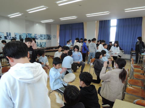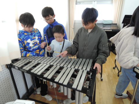 次に、「おもちゃのチャチャチャ」の曲に合わせて、打楽器を打ち鳴らしました。 16種類の打楽器に全員が触れるように、曲に合わせて楽器も交代していきます。目まぐるしく楽器が交代しても、みんなの知っている曲だったので、上手に「チャチャチャ」の所で、リズムを刻んでいました。 |