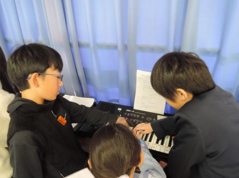 最初は、「君をのせて」の曲に合わせて木琴、鉄琴、キーボードを演奏しました。5年生のサポートのおかげで、幼稚園のお友だちも、すぐに旋律を覚えて、上手に演奏していました。 手でリズムをとってあげたり、一緒に弾いてあげたりと、微笑ましい姿がたくさん見られました。 |
