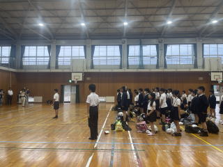 【出発式】 スローガン「平和の大切さを学び みんなで最高の思い出を」を意識して、修学旅行のスタートです。 みんな元気に「行ってきます!」 |