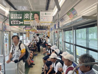 【広島電鉄】 駅ビル2階の真新しいホームから路面電車に乗り、 原爆ドームへ移動しました。 |