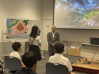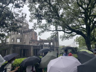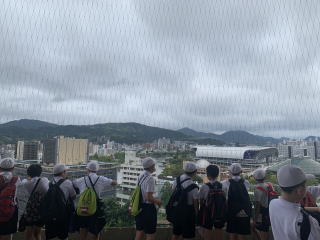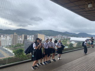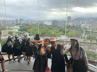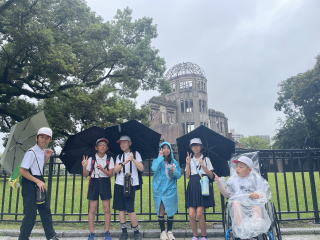 【原爆ドーム】 原爆ドームについて校長先生からお話を聞いた後、原爆ドームの周りを歩いて見学しました。原爆によって半壊、崩れかけた外壁と鉄骨をむき出しにした無残な姿に、戦争の恐ろしさを感じました。 |
