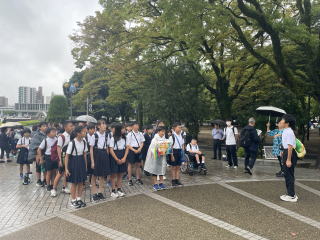 【戦争体験講話・碑めぐり】 被爆体験者の方から、貴重なお話を聞かせていただきました。みんな真剣にメモをとりながら聞いていました。碑めぐりでは、被団協のボランティアガイドさんに平和記念公園内を案内していただきながら、当時の様子など詳しく教えていただきました。 |