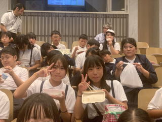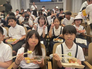 【昼食】 待ちに待った昼食の時間。おうちの方に作っていただいたお弁当に、みんな笑顔です。 |