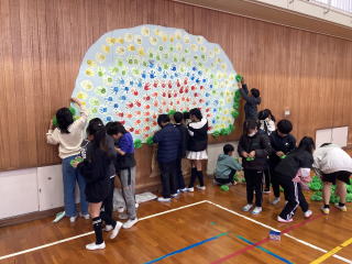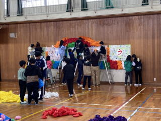 | 5年生「6年生を送る会に向けて」 2月26日(木)、「6年生を送る会」に向けて準備を進めてきました。この日に向けて実行委員6名が中心となり学級会を開き、全児童で楽しむゲームや体育館の掲示物のデザインを話し合いました。前日の5・6時間目は、実行委員は司会進行などの最後の練習、他の5年生は体育館両側の掲示物を完成させました。 |