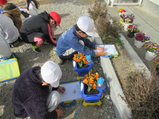 | 生活 「植物の観察」 ビオラ・チューリップの観察をしました。 もうチューリップの花が咲きそうな児童も!! 観察の視点を確認しなくても、 「どんなにおいがするかな。」「さわってみたらふわふわする!」「クローバーみたいな形の葉っぱを見つけたよ!」と、いろんな視点で観察することができました。 何色の花が咲くのか楽しみですね。 |