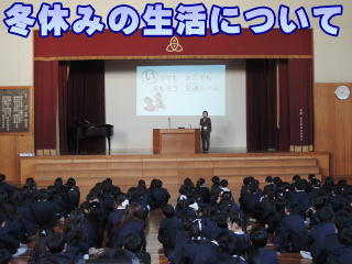 | 楽しみなイベントがたくさんある冬休みですが、規則正しい生活を心がけ、3学期に元気な姿で会えるように先生から「冬休みの生活について」お話がありました。 | |