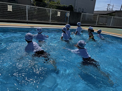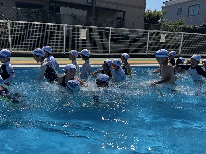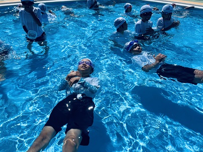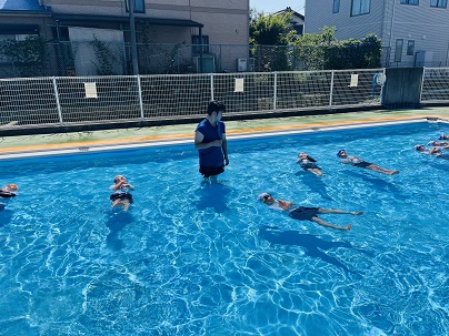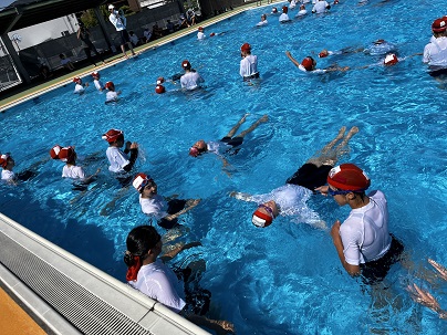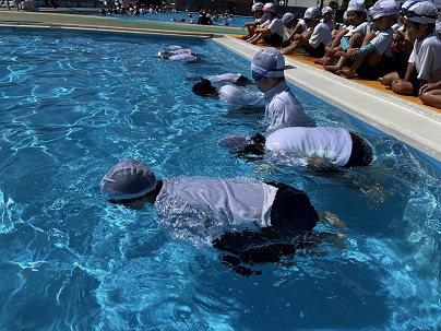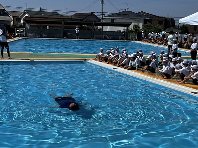 | 2年生も体操服を着てプールに入りました。 先生による実演のあと、 浮いたりペットボトルにつかまったりする 活動を体験しました。 |
