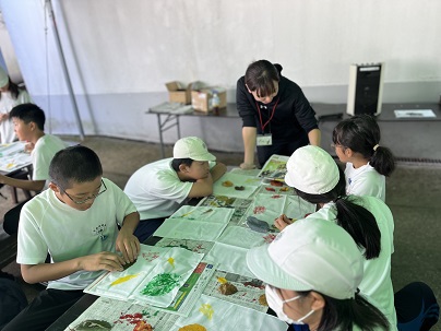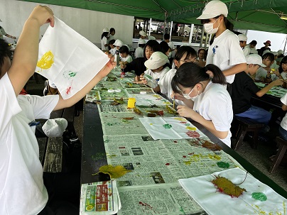 午前中の活動は「オリジナルハンカチづくり」です。 森で落ち葉を拾い、それに絵の具をぬってハンカチに押していきます。 どこに葉を配置し、何色にするのか?子どもたちはいろいろ工夫して、作品を仕上げていきました。 |