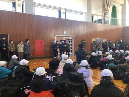 【出発式】 「4泊5日、おうちの人とはなれて過ごすことになるけれど、多くのことを学んできたいと思います。」 代表児童の挨拶に決意がこもっていました。 |