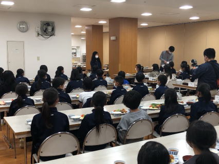 | 【夕食】 感染症対策は自然学校でも。 学校の給食と同じように、 みんな同じ方向を向いて黙食です。 |
