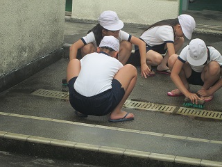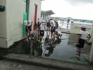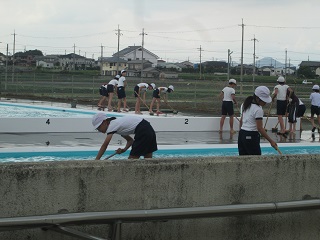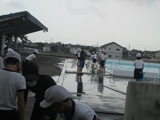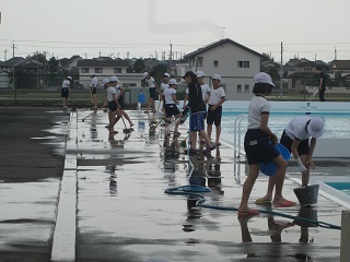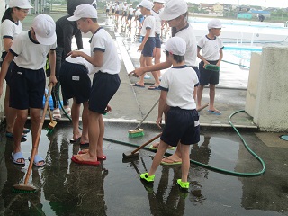 5年生と6年生が、昼休みを利用してプール周りの掃除を行いました。今年はプールの壁を業者の方が塗装してくれたので、ピカピカになりました。なので、今年はプールの中の掃除はなく、プールサイド中心の掃除でした。