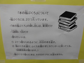 | 年始にお店で売り出す福袋は購入したことがありますが、学校の図書室で「本の福袋」は初めて見ました!! 図書委員会が考えた、みんな本を読んでもらうために考えたアイデアは、なんと、「本の福袋」でした。 素晴らしいアイデアです。 |