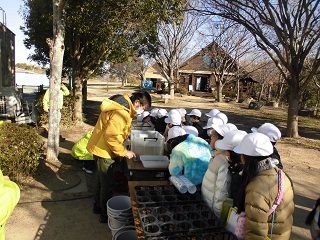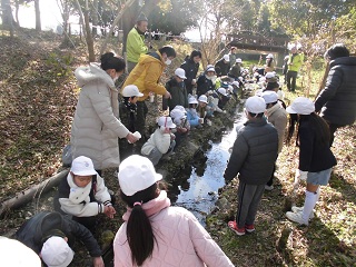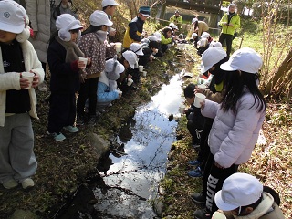 川辺にホタルの幼虫を放流しました。 子どもたちは、「たくさん食べて、大人になってね」「5月になったら、見に来るからね」「好き嫌いしないでいっぱい食べてね」などなど、かわいい声かけをしながら、放流していました。 |