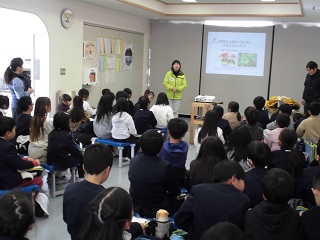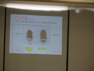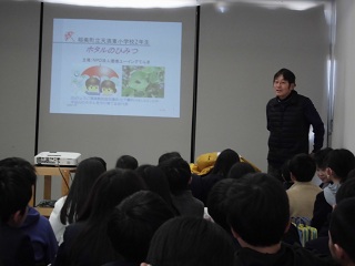 | ホタルの生態について、詳しくそしてわかりやすく教えていただきました。「ホタルは卵の時から光ります」と先生が言うと、「どうしてですか?」と質問が出ました。 |