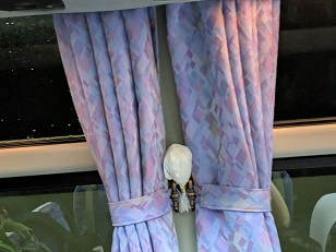 天気はあいにく小雨がぱらぱら。 雨具など楽しむ準備はできていますが、 やっぱり晴れてほしいなあ…。 バスには即席のてるてる坊主が。 |