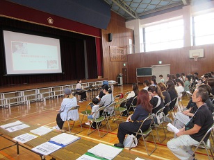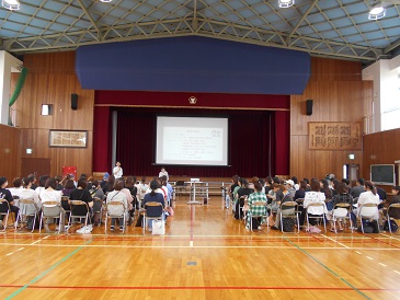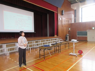 | まずは体育館で、栄養教諭から 稲美町の給食と食育について 説明がありました。 |