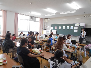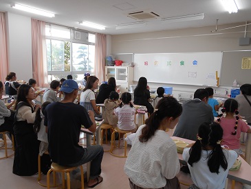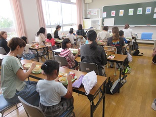 | その後、各教室で給食の時間です。 1年生は配膳を上手にできるようになり、 保護者の分も一生懸命準備しました。 その成長した様子も見てもらえました。 「いただきまーす!」 おいしい給食を食べながら、 親子で楽しそうに食事をしていました。 |