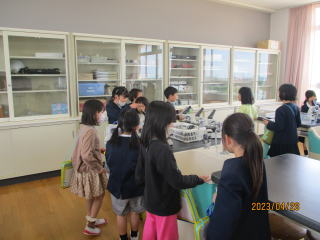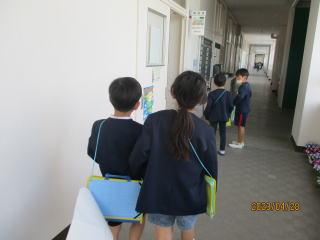 学校探検(1,2年) (4月28日) 今日の3,4時間目は 学校探検で2年生が 学校内を 1年生に案内しました。 2年生は今日の日に向けて 事前に各教室を調べ、 1年生にわかりやすく伝えることができました。 |