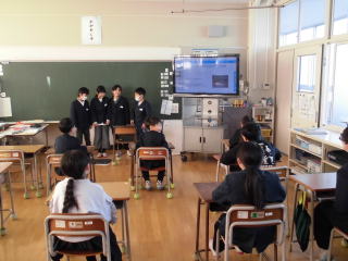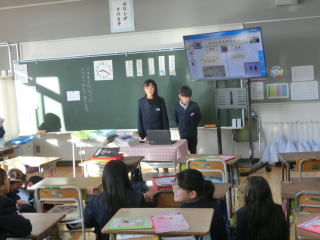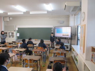 縦割り班メンバーに学んだことを 紹介しました。 何度も教室で練習したのでどの班も しっかりプレゼンができました。 |
