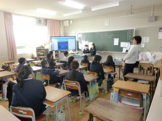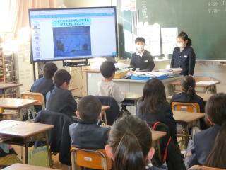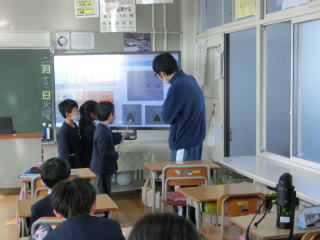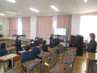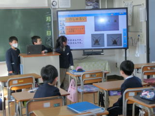 縦割り班への学習発表(2年生) (2月13日) プレ環境学習で行った ホタルの幼虫放流の様子、 ホタル先生に教えてもらった「ホタルについての学習」 をプレゼン形式にまとめ、 縦割り班メンバーに紹介しました。 |
