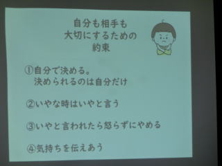 ![]() いのちの教室の最後には 「自分も相手も大切にするための約束」 について教えていただきました。 |
