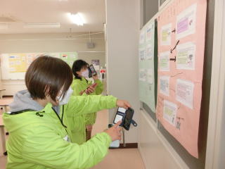 隣の部屋に展示している 2年生が国語、総合で学習した 「稲美町で働く人の仕事」についての まとめを見ていただきました。 QRコードを読み取り、 説明を聞いていただきました。 |