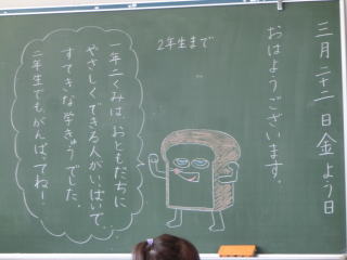 各教室の黒板には担任の先生からの メッセージが書かれていました。 |