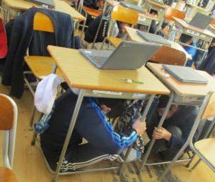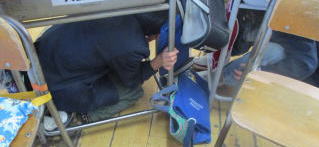 | 机の下に頭を守りながらしっかり机の支えをもって静かに避難しました。 | |