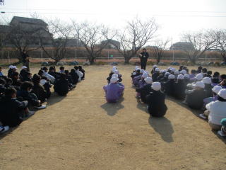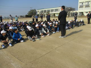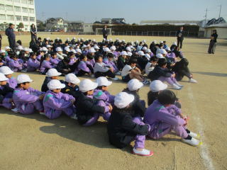| 素早く避難行動がとれました。いつもの避難場所に集合、整列し人数確認をしました。 | 防災担当からのお話です。ガラスをよけて避難できたこと 「おはしもて」の確認や、 登下校での避難方法の確認などのお話を聞きました。 |