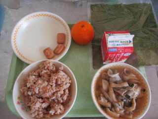 | 梅かつおごはん、豚汁(震災の炊き出しメニューの一つ)、カンパン(備蓄品)、焼きのり、牛乳、ぽんかん | ![]() |