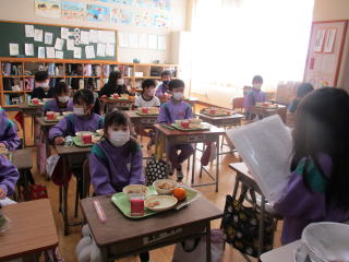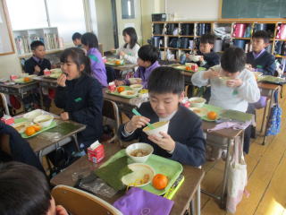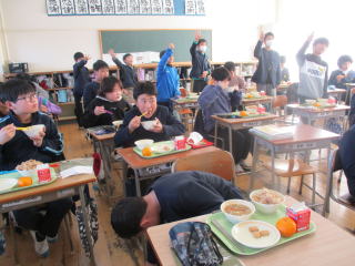 | 震災で犠牲になられた方々に哀悼の意を表し、黙祷を捧げました。本日の給食は震災メニューです。 | |