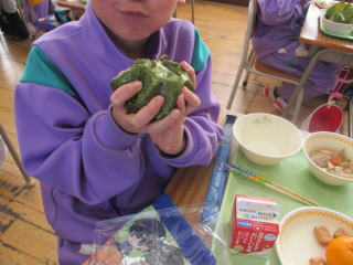 焼きのりをごはんに入れて、ジャンボおにぎり! 1年生にとっては初めていただくメニューで乾パンなども初めて口にする子もいました。 |