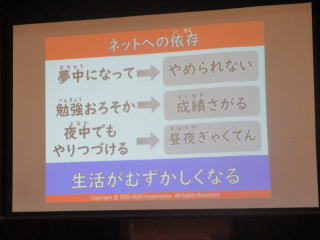 | インターネットやSNSは、日常生活や健康に支障をきたすほどのめり込んでしまうことがあります。ネットへの依存、ルール作りでコントロールする大切さ、個人情報を載せないなどといったことを教えていただきました。ありがとうございました。 | |