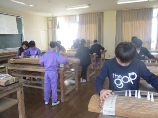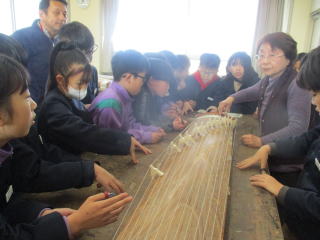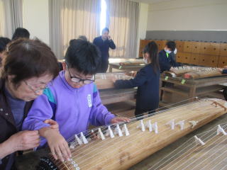 | 図工室からお琴の和の美しい音が響き渡っていました。みんなで「さくら」を演奏できるようになりました。日本の伝統文化である和の楽器「琴」に触れる貴重な体験ができたことに大変感謝しています。ありがとうございました。 | |