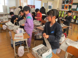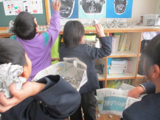 自分で作った作品の鬼に向かって新聞豆まきをしました。