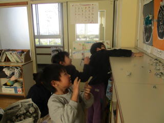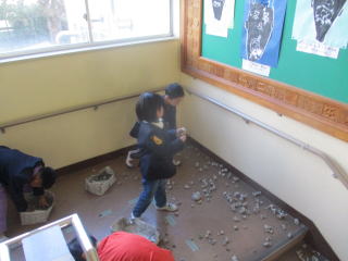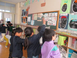 教室後ろの掲示板や、階段踊り場の掲示板に移動して豆まき