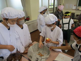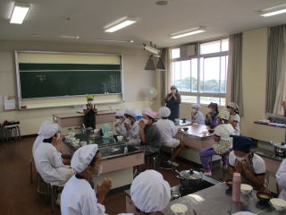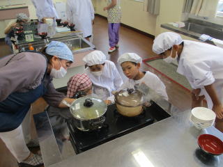 | 1,2時間目 家庭科 ごはん、みそ汁 事前に味噌汁の出しの飲み比べをして、どのだしで味噌汁を作るか班で考えました。 そして本日、煮干しでだしを取ったり、あごだしや昆布だしなど各班でそれぞれ違うだしを使って味噌汁作りにチャレンジしました。また、ごはんは炊飯器ではなくお鍋で炊きました。各班で味噌汁に入れる具を決めて切っています。サツマイモ、タマネギ、豆腐、あげ、わかめなど具だくさんで美味しそうな味噌汁ができました。 |