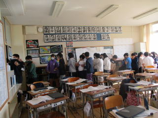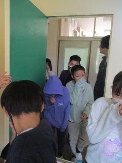 まず、放送の内容を静かに聞きました。 教室の窓を閉め、煙を吸いこまないように、口を押えて避難の準備をしています。 |