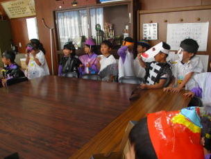 | 職員室にお邪魔 「trick or treat」と言いながら 笑顔いっぱいの表情で子どもたち。 |