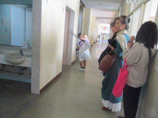 | 1階のなんなん広場のほうにもお邪魔 「かわいいね」 「上手に作って変身したね。」などと声をかけてもらってうれしそうな1年生。 |