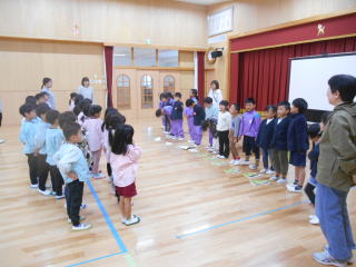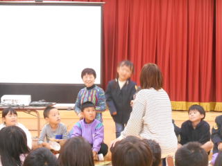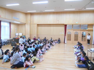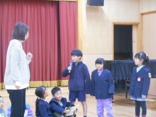 | 2時間目 バンビ第1保育園との交流 1年生が年中さん、年長さんの前で国語の学習「くじらぐも」を音読発表。 |