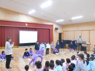 | 小学校で好きな科目を一人ずつ紹介していきました。 運動会で発表した表現演技の中の「ブリッジ」を披露してくれた人もいました。 |